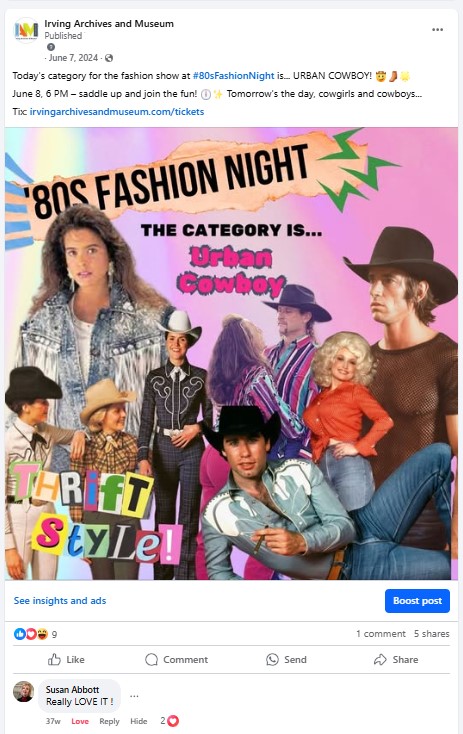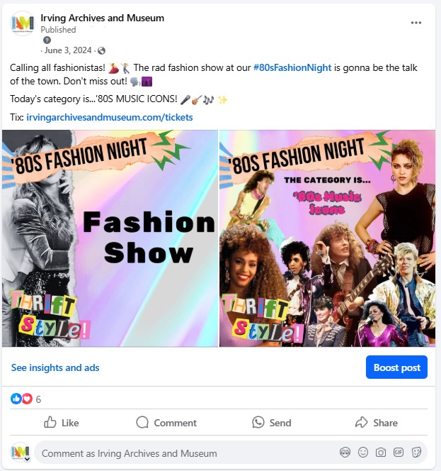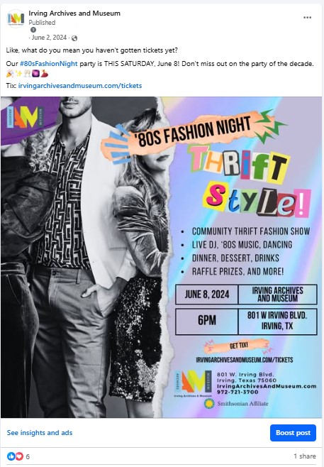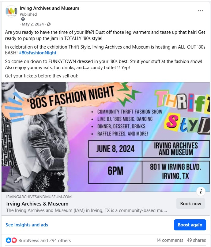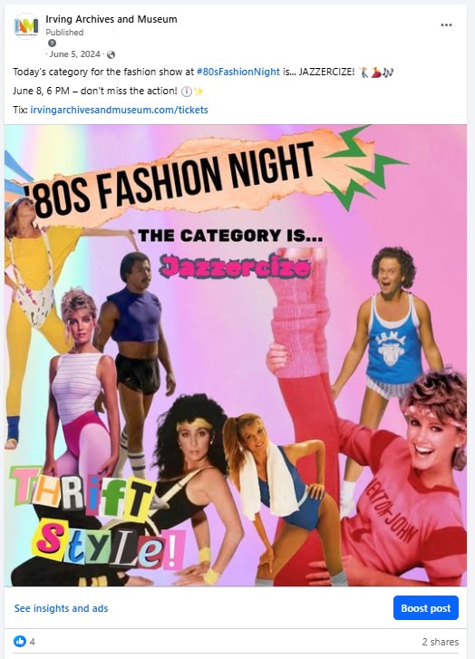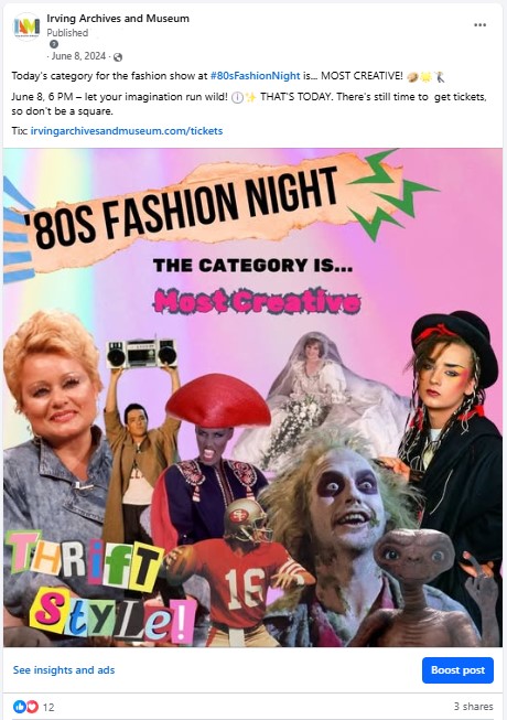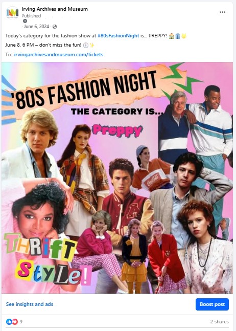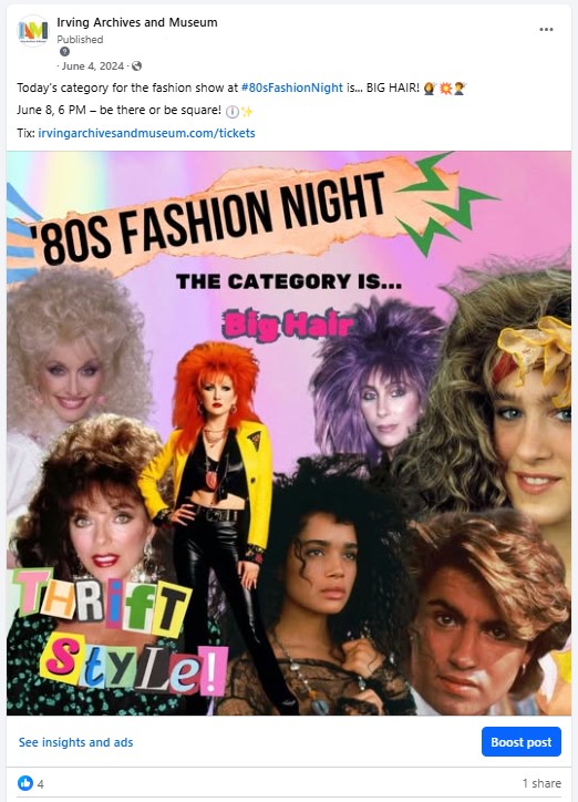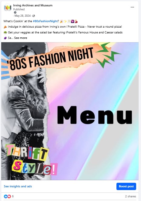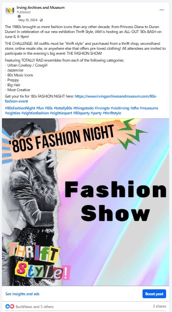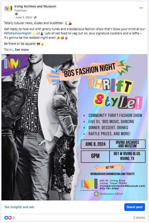 To promote a special exhibition at the Irving Archives and Museum, I developed and executed a multi-channel marketing strategy for 80s Fashion Night: Thrift Style: an immersive event designed to drive engagement and boost attendance.