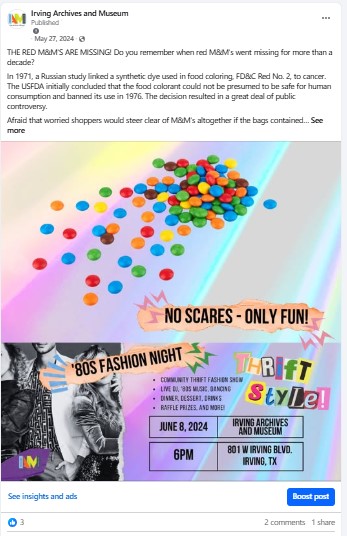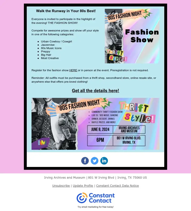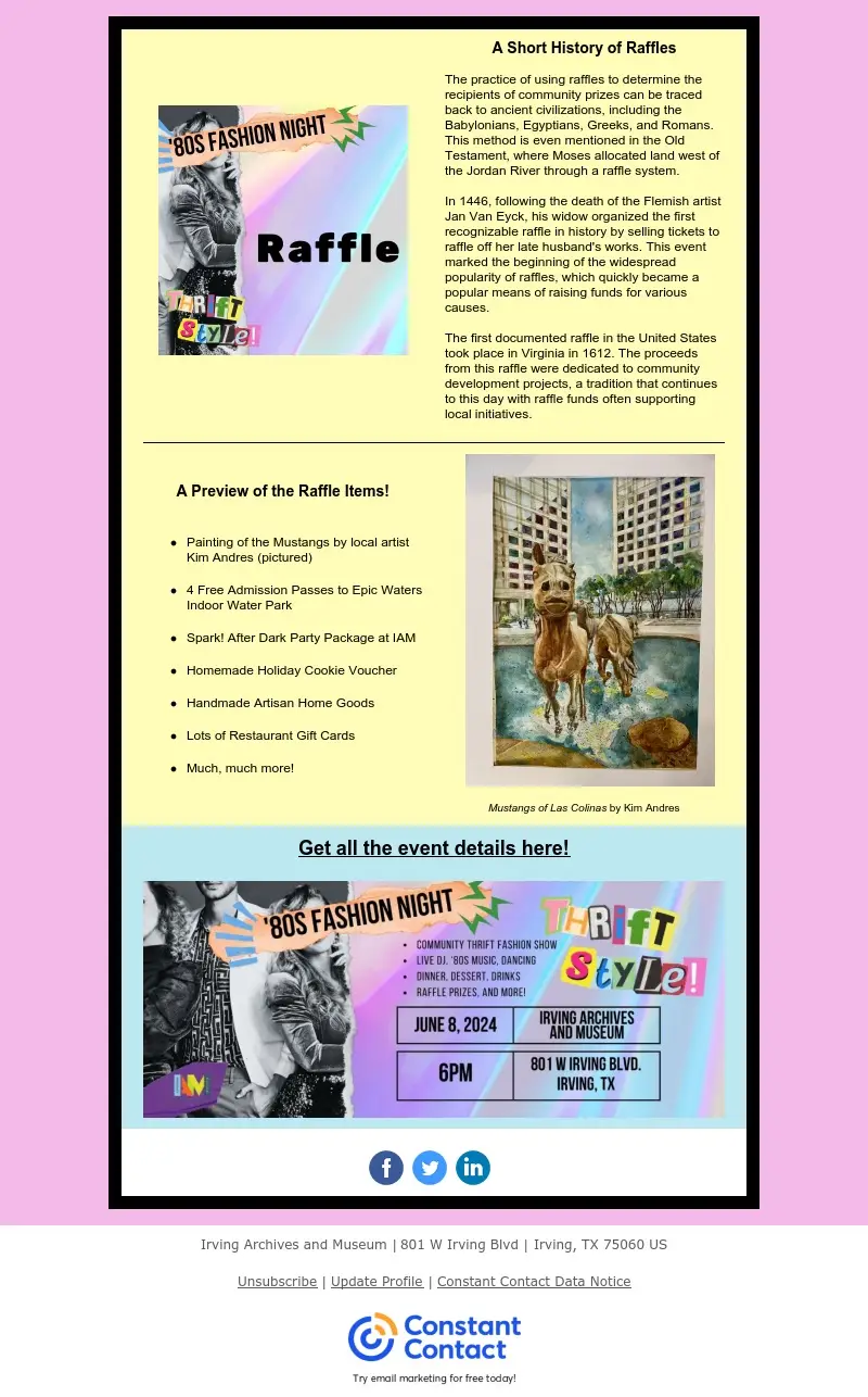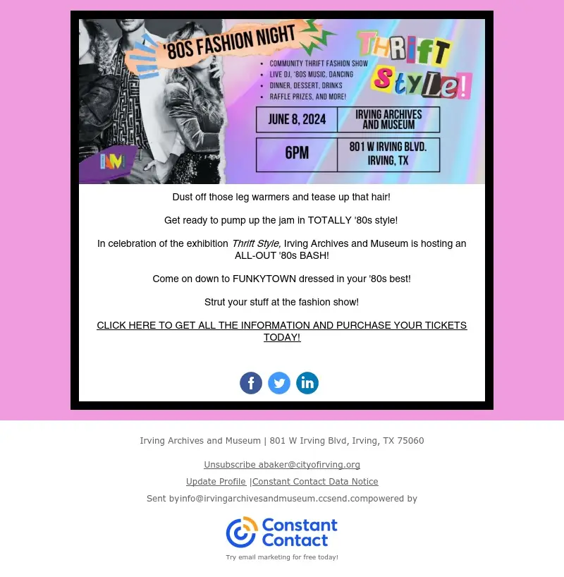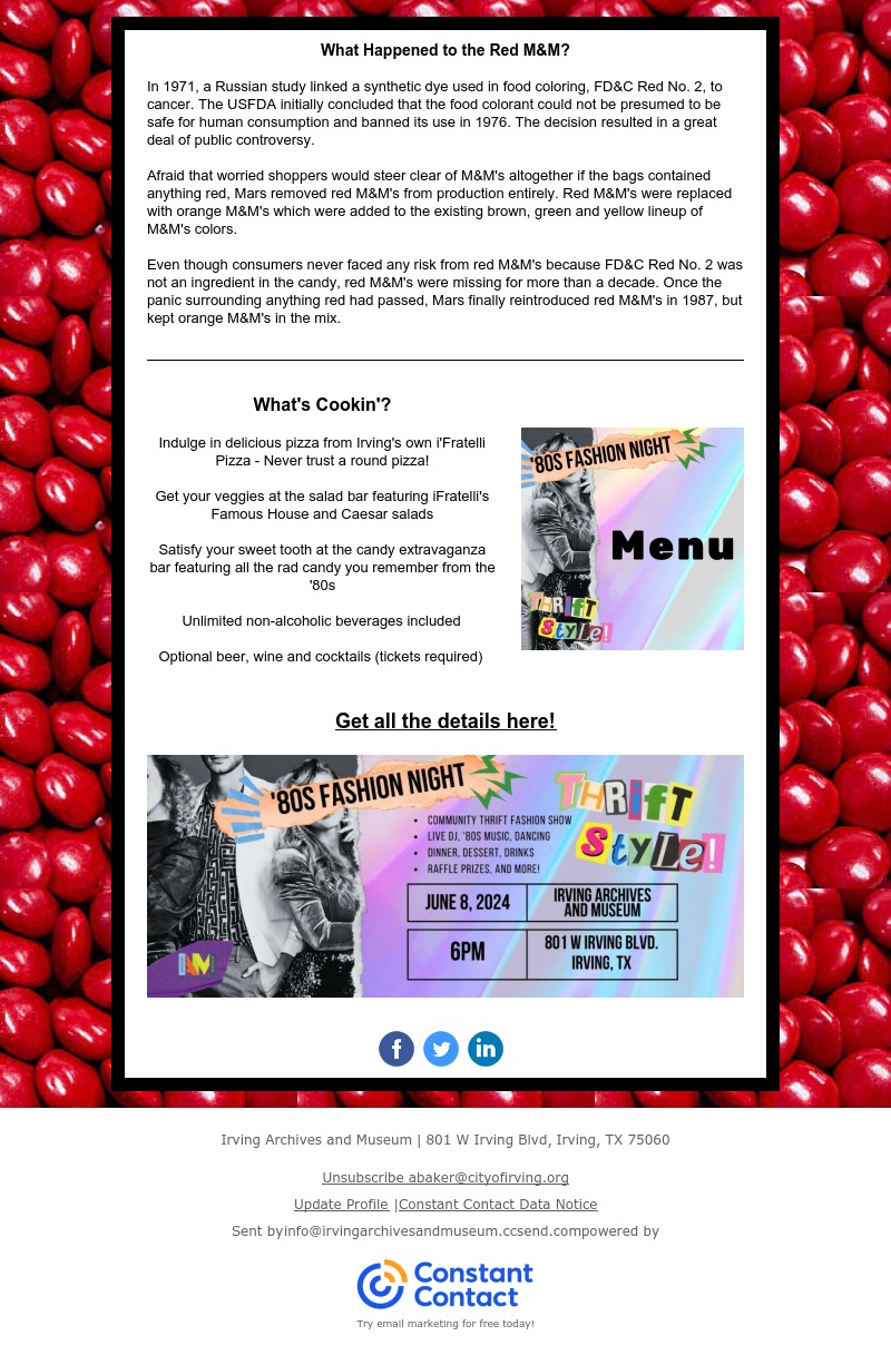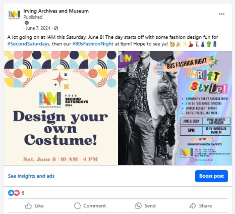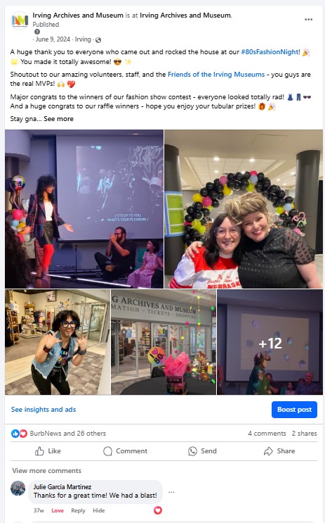 To promote a special exhibition at the Irving Archives and Museum, I developed and executed a multi-channel marketing strategy for 80s Fashion Night: Thrift Style: an immersive event designed to drive engagement and boost attendance.